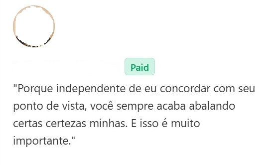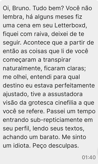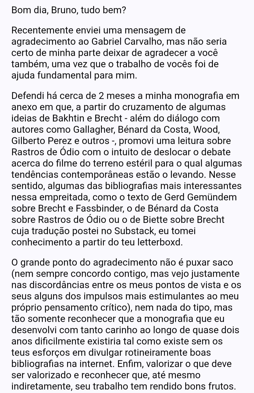 Sobre essas divergências, ou mais precisamente a constatação da parte de leitores de que há na divergência um estímulo ao pensamento que pode ser (e frequentemente é) mais forte que o que vem da concordância: foram três manifestações, uma mais ou menos próxima da outra, duas aqui no Substack e uma por e-mail, e as três demonstraram um tipo de inteligência, de sensibilidade, de discernimento que se vê muito pouco, mas felizmente não mais cada vez menos, na crítica e na cinefilia.